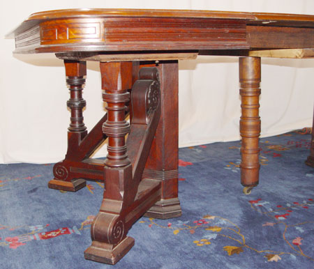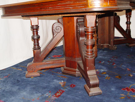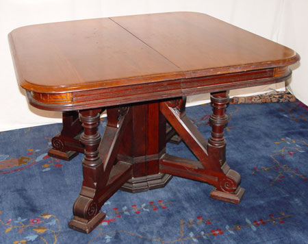 PERIOD VICTORIAN WALNUT DINING TABLE WITH 6 LEAVES: Ornate classic Victorian legs, 29''h. x 45'' square with leaves out. There are 6 leaves, 12'' wide each . Please note leaves varying degrees of condition.