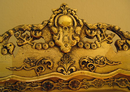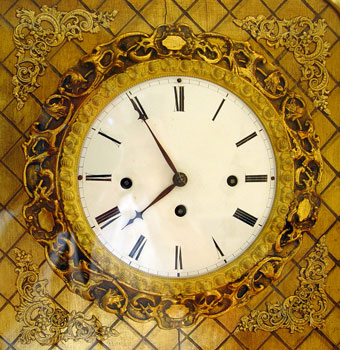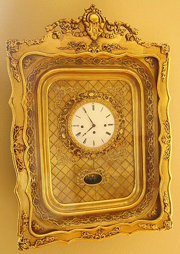 VICTORIAN GILT SHADOWBOX FRAMED CLOCK: Unique shadowbox design framed Victorian gilt wood clock. Key and pendulum. Coil gong. Front of frame opens for easy key winding. Marked on works ''F Kunz In Wein''. Measures 27 3/4'' high x 19 1/4'' wide x 6'' deep. Please note crack in wood center of clock.