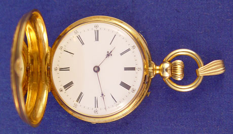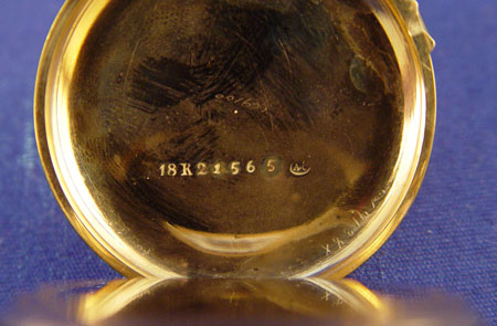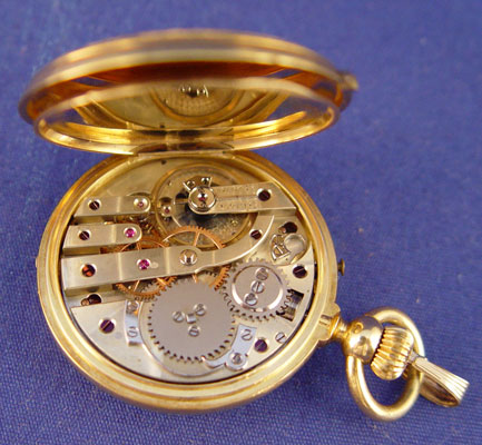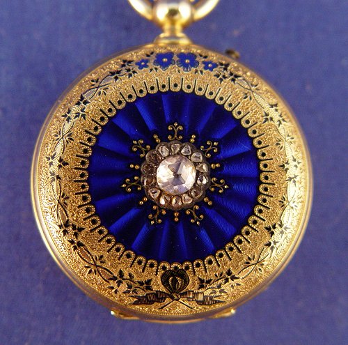 LADIES GUILLOCHE ENAMEL, 18K GOLD & DIAMOND POCKET WATCH PENDANT: Lovely yellow gold hunt case pocket watch with etched design centered front and back with guilloche enameling of cobalt accented by gold and set with round rose cut diamonds, center stone approx. .25ct, SI1 in clarity and J in color, surrounded by fifteen irregular shaped rose cut diamonds, approx. .15ctw, SI in clarity and J in color, front missing two of the small diamonds, trimmed in black enamel foliate ribbon. White porcelain face with black enamel Roman numerals, minute marks and hands. Case approx. 1 3/8''dia., marked 18k 21565 and AC? in a circle, works unmarked, currently running but accuracy unknown. 52.5 grams total.