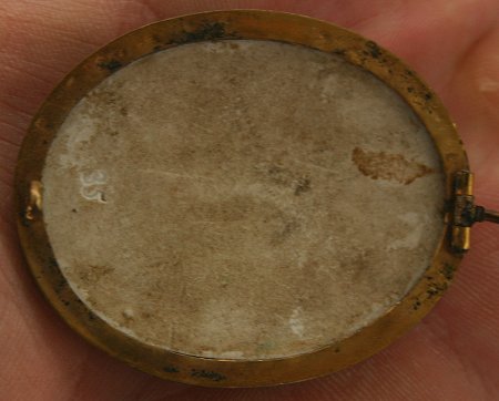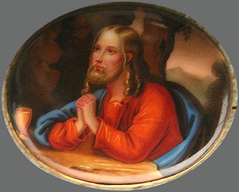 MINIATURE PAINTING ON PORCELAIN OF JESUS: Encased in 14k gold (acid tested) brooch frame, 1 5/8'' x 2'', porcelain impressed 35, circa 1900.