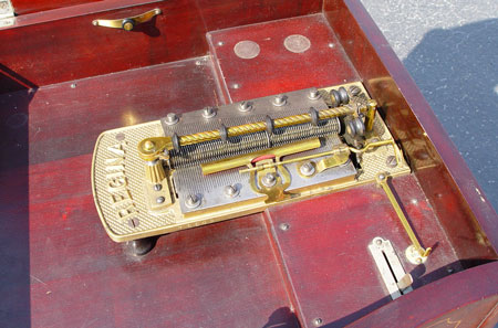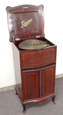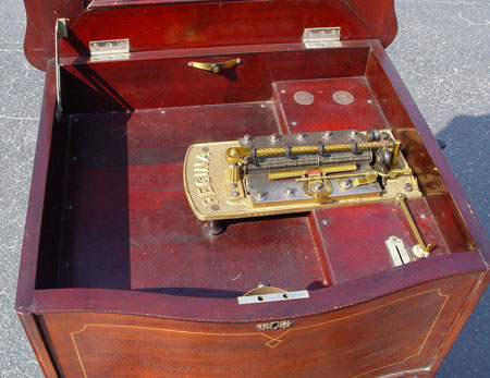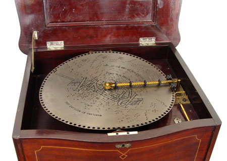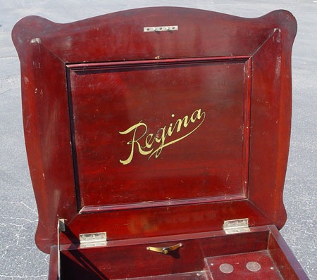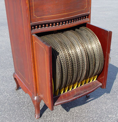 REGINA DISC MUSIC BOX IN MAHOGANY CABINET: Sold with 37 discs. Serpentine style 50 in desirable floor mahogany cabinet with string inlay and stick & ball gallery above the storage. Double comb with all visible tines intact. Working condition. Sold with 37 discs, 15 1/2'' dia. 40 1/4'' high x 22 1/2'' across x 20''. Est. $4000/6000**