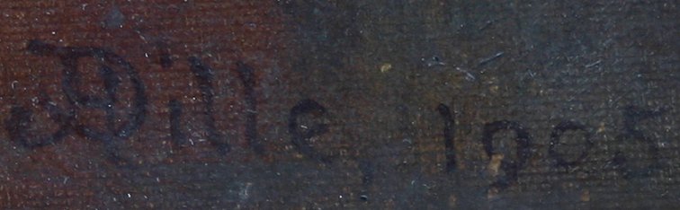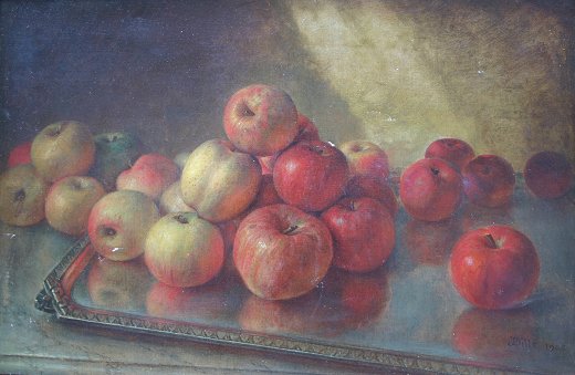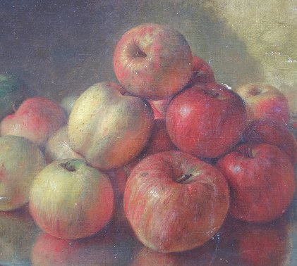 EXCEPTIONAL INDISTINCTLY SIGNED STILL LIFE OF APPLES: Oil/Canvas, 16'' x 24'', signed JH Dille?, dated 1905, encased in later signed, gilded and dated frame, 22'' x 29''. Re-lined, several spots of minor in-paint visible, several abrasions with paint flecks, repair to tear, indentation upper left quadrant.