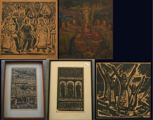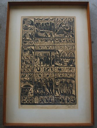 PETRAVICIUS, Viktoras, (Lithuanian, 1906-1989): Tapestry of Figures and Scenes, Woodcut, sight size 31'' x 19'', pencil signed and dated 1948, #2/7, encased in wooden frame with wear, 41'' x 28''.