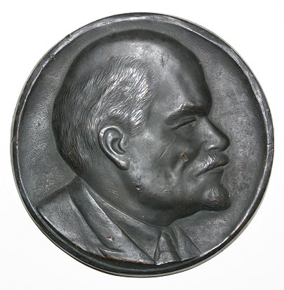ROUND BRONZE PLAQUE OF STALIN: Unsigned, period piece with dark patina, 5 3/4''dia., 1/4'' thick, no visible signature or foundry mark. Several dents and abrasions.