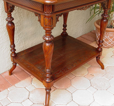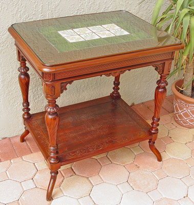 VICTORIAN ERA MAHOGANY TILE TOP TABLE: 24 dark green, fern, and flower design tiles center the table top. Two tiers with carved legs. 28 3/4'' h x 27 1/4'' x 21 1/4''.