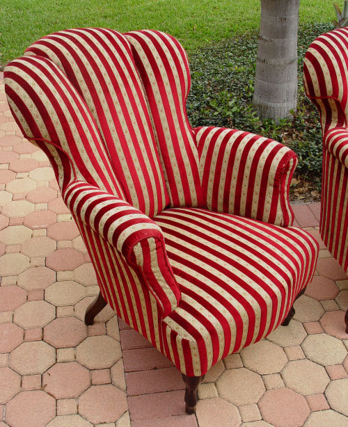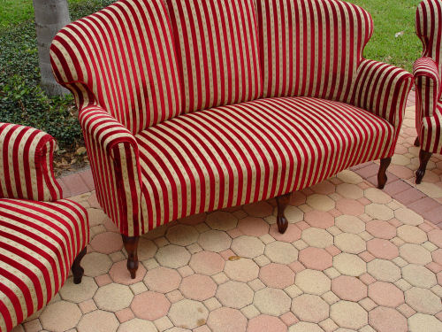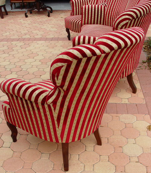 3 PIECE VICTORIAN PARLOR SET: Excellent condition, newly upholstered in rich strip fabric. Mahogany feet. The set includes the petite sofa , 41''h. x 61''long, and two matching arm chairs.
