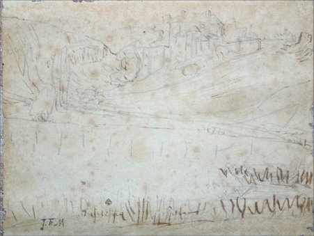 MILLET, Jean Francois, (French, 1814-1875): Landscape Sketch, Pen/Pencil, 4 1/4'' x 5 3/4'', monogrammed. Several holes, areas of browning, sold as is. Est. $500/800**