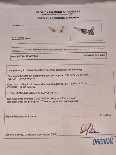 1 CTW DIAMOND STUD EARRINGS: Two round brilliant diamonds in 14K yellow gold. 1 Ctw, average VVS2-VS1 in clarity, E-F color. The diamonds are prong set, threaded post and nut closure. Florida Diamond Appraisers GIA retail replacement value is $7500.