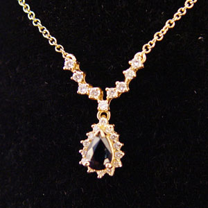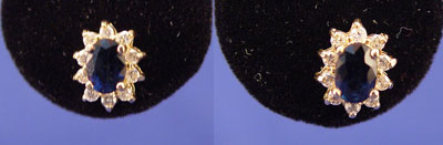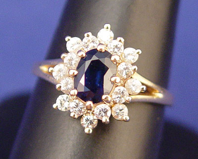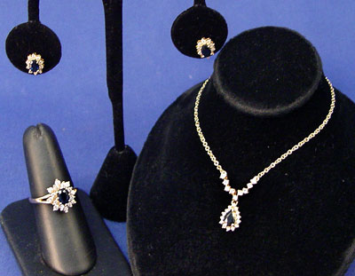 14K 3.25 CTW SAPPHIRE AND 1.15 CTW DIAMOND RING, NECKLACE AND EARRING: 14K yellow gold ring earrings and necklace with 3.25 CTW blue sapphires. Rated VS in clarity (Type II), B (blue) in Hue, 7 in Tone and 2 in Saturation. 1.15 CTW round full cut diamonds. Rated VS in clarity and G-H in color. The diamonds and sapphires are prong set. Ring is size 8. Necklace is 18'' with anchor link chain and lobster claw clasp. Earrings are post and (gold filled) clutch closures. Weight: 12.1 Est. $900/1200**