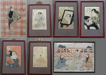 LOT OF 19TH C JAPANESE WOODBLOCK PRINTS: Two unframed, five in matching frames, various artist; one unframed piece is backed and re-enforced, the other has trimmed margins; the remaining five have not been examined out of the frames but appear to in good although faded condition. Sold as is, as a lot. Est. $500/800**