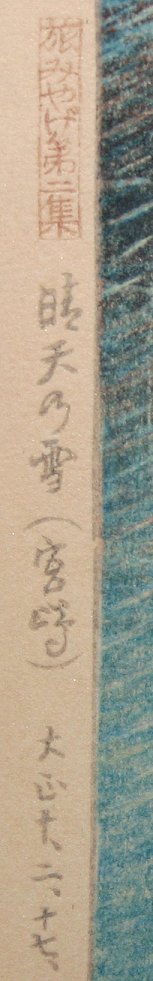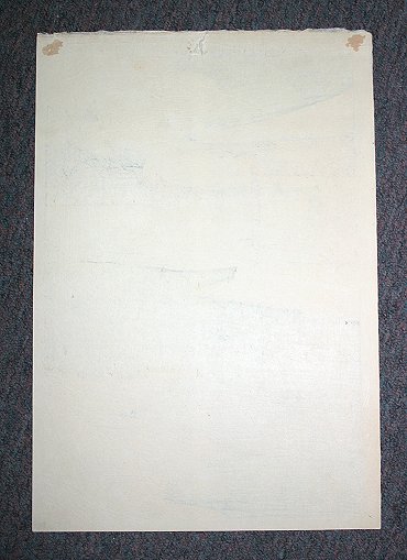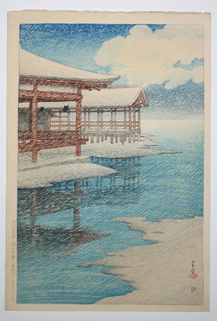 HASUI, Kawase, (Japanese, 1883-1957): Winter Waterside Scene, Woodblock, 15 1/4'' x 10 1/2'', unframed, full margins. Slight yellowing in clouds, verso glue residue and thin dime size paper loss in upper margin.