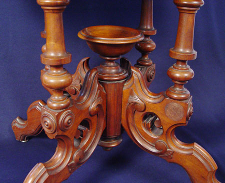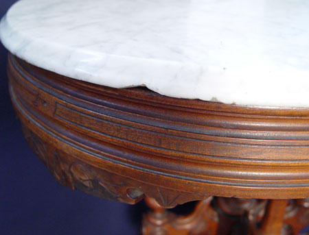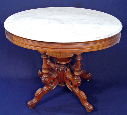 HIGH VICTORIAN MARBLE TOP LAMP TABLE: Oval marble top over an elaborate pillar and scroll pedestal base. 28 1/2'' h. x 33 1/2'' x 25''.