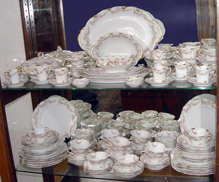 THEODORE HAVILAND FRENCH LIMOGES CHINA SERVICE: Ca. 1904- mid 1920's. 129 pieces to include 12 dinner plates, 6 salad plates, 9 bread plates, 7 soup bowls, 6 bouillon cups with underplates, 13 dessert bowls, 12 cups, 22 saucers, 6 demi-tasse cups and saucers, 6 ramekins with underplates, 6 butter pats. Service pieces include 3 platters (12-16''), oval vegetable bowl, covered vegetable , and gravy .