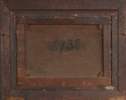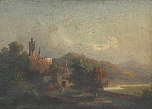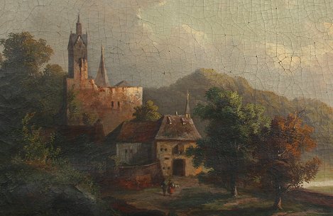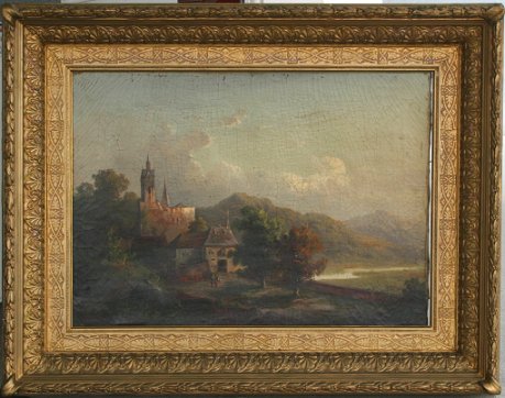 19TH C OIL/CANVAS LANDSCAPE WITH FIGURES NEAR A CASTLE: 18 1/2'' x 26'', encased in fine, heavy, deep gilded gesso frame with repair and over-paint, 29'' x 35 1/2''. Heavy cracklure, with areas of paint fleck, needs cleaning and restoration.