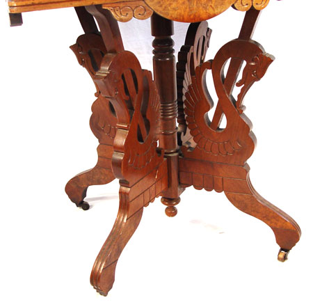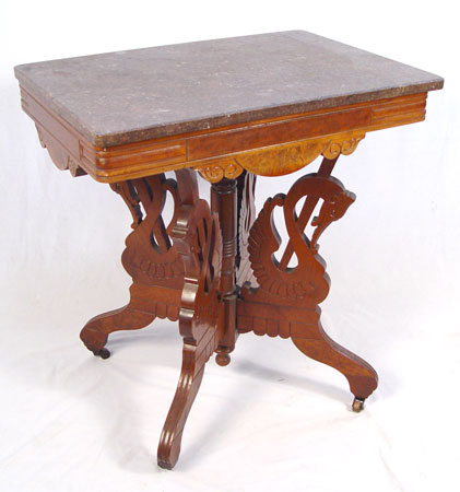VICTORIAN SWAN BASE MARBLE TOP LAMP TABLE: At first glance one may miss the four swan base supports. Red/brown marble top. 30''h. x 20'' x 28''.