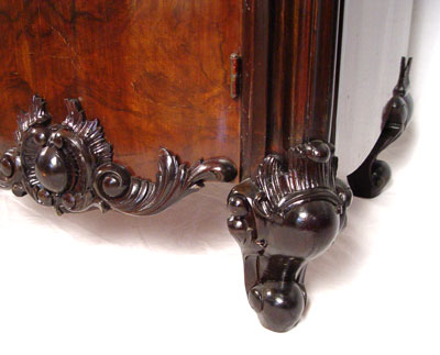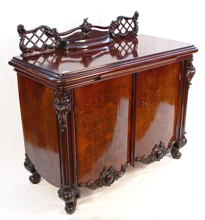 FINE MAHOGANY ROCAILLE CARVED CREDENZA: Pierce carved crest, carved stiles and feet. Pull out extension over slightly bowed cabinet doors. 67'' high x 88'' wide x 26'' deep.