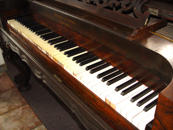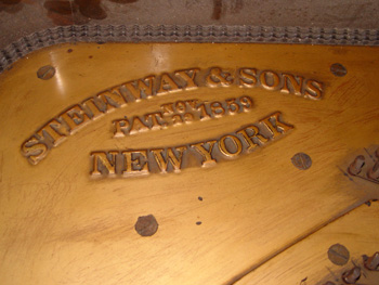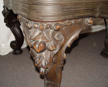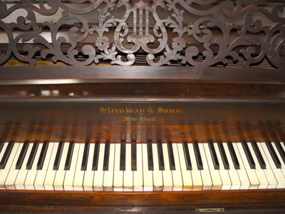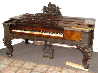 STEINWAY & SONS VICTORIAN SQUARE GRAND PIANO: Carved Rosewood case with ornately carved legs and shaped skirt. ''Steinway & Sons New York''. Pierce carved music stand. 52 ivory keys. Please call for condition. Good sound, will need tuning. 37 1/4'' high x 84'' wide x 43 1/2 deep.