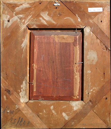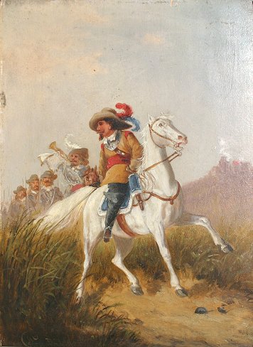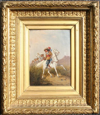 19TH C ILLEGIBLY SIGNED CAVALRY SCENE: Oil/Wood Panel, 8 1/4'' x 6 1/4'', encased in period acanthus leaf motif gilded gesso molding with over-paint and minor wear, 16'' x 14''. Minor frame wear, needs cleaning.