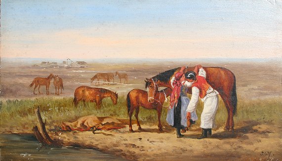19TH C EUROPEAN LANDSCAPE WITH HORSES: Oil/Board, unframed, 6'' x 10 1/4'', monogrammed lower right T.W?, scene depicts a man helping a woman onto a horse with more horses grazing in the distance. Several minor abrasions, needs cleaning.