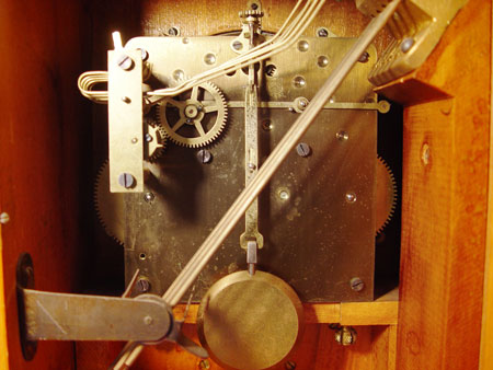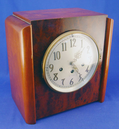 SETH THOMAS ART DECO STYLE SHELF CLOCK: 8 day Westminster chime movement #113. Wood case, key & pendulum. 6 5/8'' metal face with Arabic numerals marked Seth Thomas made in USA. 10 3/4'' high x 10 3/8'' wide x 6 3/4'' deep. Note minor chips to wood case.