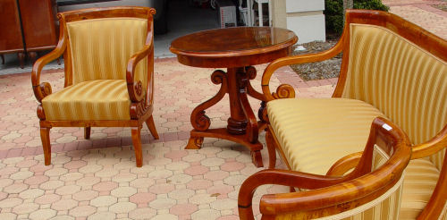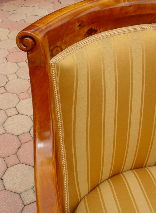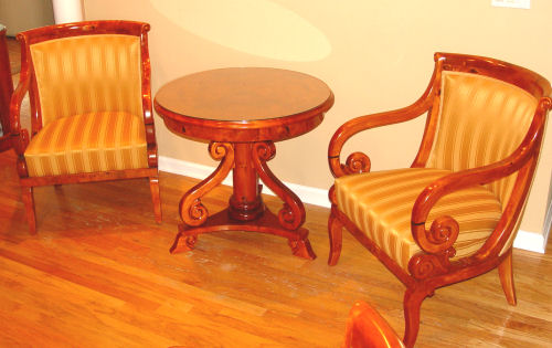 4 PIECE YEW WOOD PARLOR SUITE: Scrolled open arm matching settee and 2 chairs, also the matching lamp table. Settee is 36''h. x 64'' long. x 25''. The table is 28 1/2'' tall x 31'' dia.