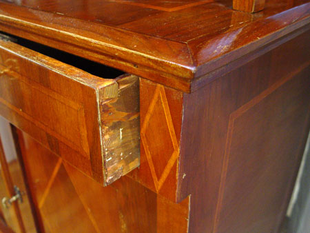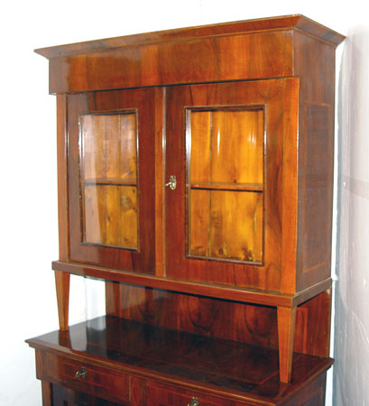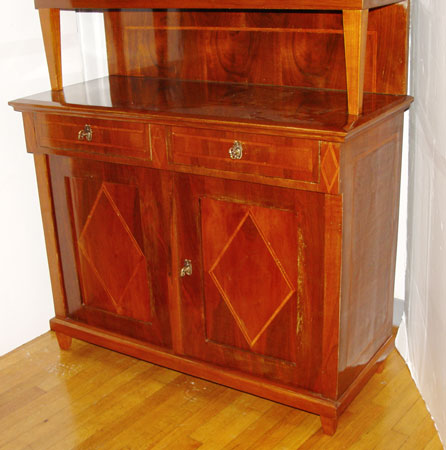 BIEDERMEIER STYLE BOOKCASE / CURIO DISPLAY CABINET: Upper section with glass front doors and open shelf. Lower section has geometric inlay door fronts. 80'' x 43'' x 19