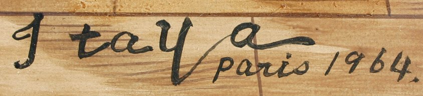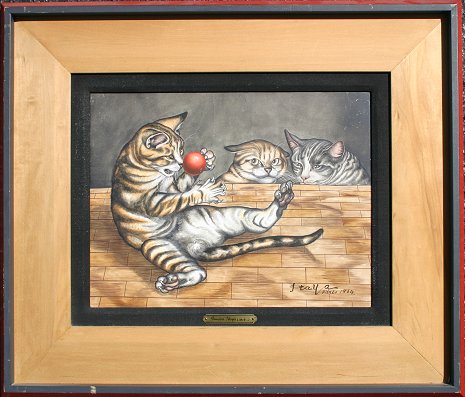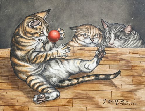 ITAYA, Foussa, (French/Japanese, born 1919-): Three Kittens with a Red Ball, Oil/C, 10 1/2'' x 13 3/4'', signed, dated Paris 1964, custom painted frame with minor wear, 19'' x 22''. Several small abrasions, some cracklure, good overall. Est. $800/1200**