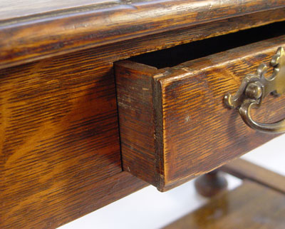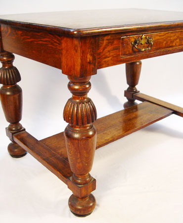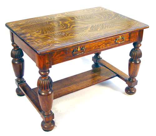 LATE 19TH C TIGER OAK LIBRARY TABLE: Most richly grained quarter sawn or tiger oak top, single drawer, full legs. From the Albert Whitted house in St. Petersburg FL. Single center drawer. 29 1/4'' high x 42'' wide x 28'' deep.