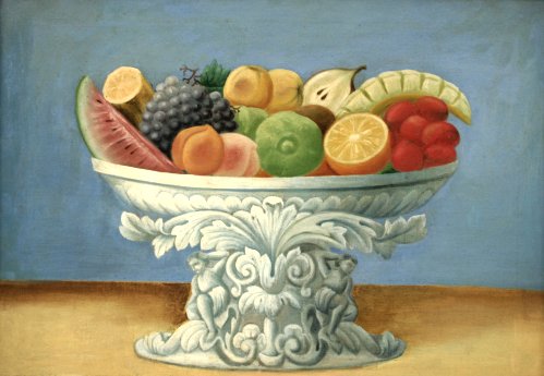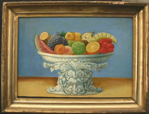 19TH C STILL LIFE OF FRUIT IN A NEOCLASSICAL PEDESTAL BOWL: Oil/Canvas, 17 1/2'' x 24 1/2'', no visible signature, encased in period gilded frame with wear, 22'' x 30''. Re-lined, pin point paint flecks, in-paint & cracklure throughout. Est. $500/800**