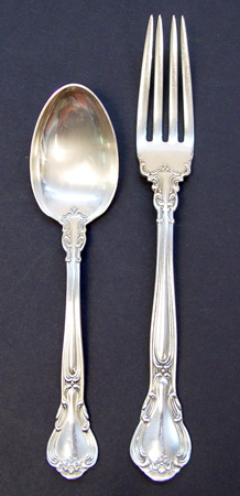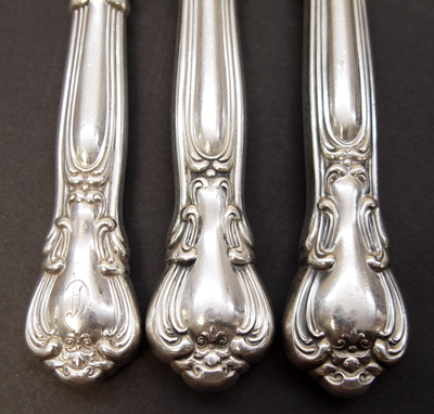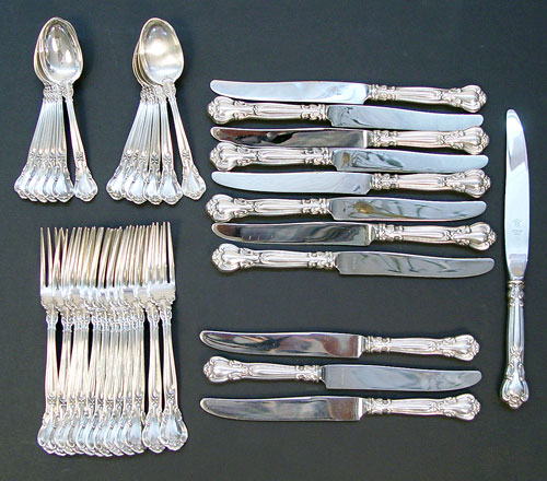GORHAM CHANTILLY STERLING FLATWARE: 36 pieces to include 12 dinner forks 6 7/8'', , 8 dinner knives 8 7/8'', 3 knives have monograms measure 8 1/2'', 1 knife measures 9 1/2'' long, and 12 teaspoons. Marked Gorham Sterling. Note flecks on blade of one knife Approx. 35.1 troy oz.