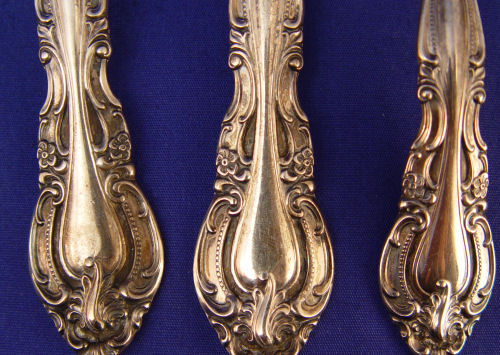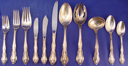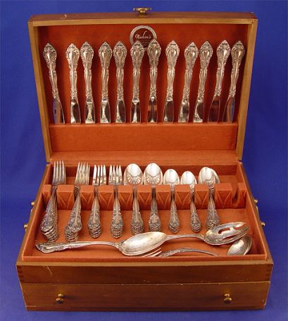 ALVIN STERLING FLATWARE SERVICE IN THE VIVALDI PATTERN: 88 piece to include: 12 dinner knives 9'', 12 dinner forks 7 1/2'', 12 salad forks, 12 dessert oval spoons, 12 teaspoons, 12 individual butter knives, 12 fish knives, large serving spoon 8 1/2'' , gravy ladle 6 1/2'', pierced spoon 8 3/8'', and meat fork 7 7/8''. Sold with the storage box. Approx. 102.5 troy oz