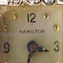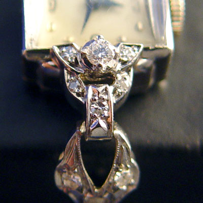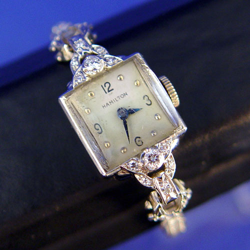 PLATINUM LADIES 1.00 CTW DIAMOND HAMILTON WRISTWATCH: 1950'S Ladies Hamilton wristwatch of platinum set with round brilliant and single cut diamonds, approx. 1.00 CTW. Rated VS in clarity and G in color. Square dial with applied ball and painted Arabic markers. Foxing on dial. Mechanical jeweled movement. The watch is not running. Convex glass crystal with small chip. Diamond bracelet has a locking clasp with safety chain attached. 6''.