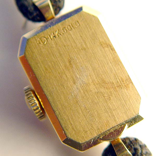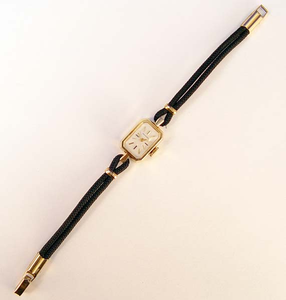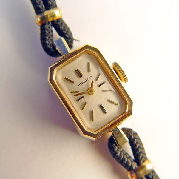 LADIES 14K MOVADO WRISTWATCH IN ORIGINAL CASE: 14K yellow gold ladies Movado wristwatch, silver-tone rectangle cut-cornered dial with applied bar markers. Mechanical jeweled movement. The watch is running. Black cord bracelet with 10K gold findings. 5'' Cord can easily be changed to a longer size. Original box. Circa: 1970's