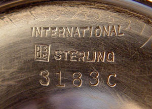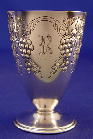 INTERNATIONAL STERLING VERMEIL CORDIAL SET: Grapes and leaf design. 12 cups marked International Sterling 3183C on bottom. 3 1/4'' high x 2 3/8'' dia. Approx 26.7 troy oz. R Monogram. Goldplate tray, Wilcox S.P. Co. International S. Co. 27. 16 1/4'' x 8 1/8''. Matching R monogram.