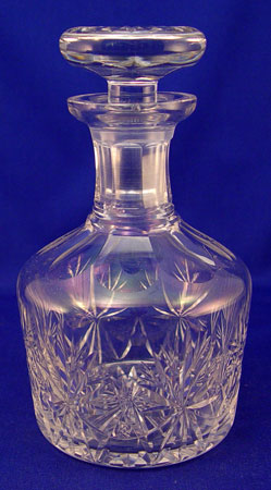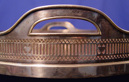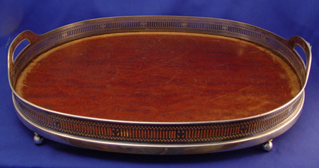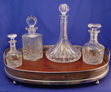 RETICULATED GORHAM SERVING TRAY & GLASS DECANTERS: Oval reticulated silverplate tray with original wood bottom, Gorham horseshoe mark indicates Ca. 1905, 22'' x 16 1/2''. Sold with a later group of Scottish crystal decanters, 6 1/2''- 13''h.