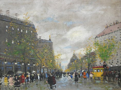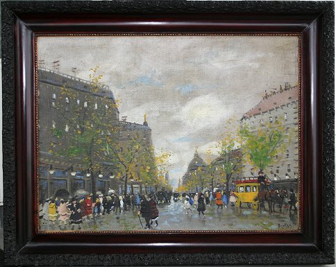 BERKES, Antal, (Hungarian, 1874-1938): Parisian Street Scene, Oil/C, 23 1/2'' x 31 1/2'', signed, encased in dark wood frame, 30 1/2'' x 38''. Several patches visible verso, obvious in-paint, needs cleaning, has been over cleaned. Est. $1500/2500**