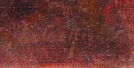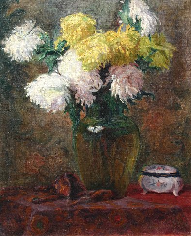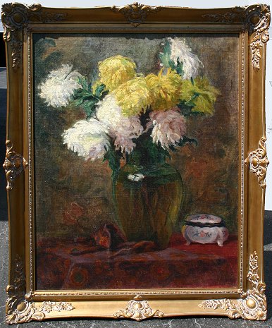 EXCEPTIONAL 19TH C FLORAL STILL LIFE: Mums in a Glass Vase, Oil/Canvas, 34'' x 27 1/4'', illegibly signed lower right, encased in gilded gesso molding, 41'' x 34''. Re-lined, sporadic in-paint.