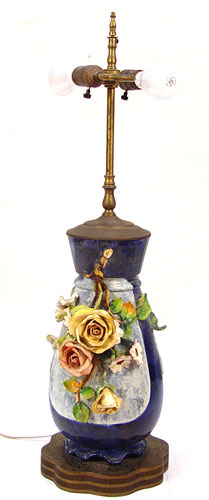 FAIENCE MANUFACTURING CO. ART POTTERY VASE / LAMP CA. 1880-1892: Applied flower decoration om cobalt glaze, drilled as lamp. Please note minimal loss of petal tips. Impressed mark FM Co. Pottery is 14 3/4'' h. lamp is 31''h. overall.