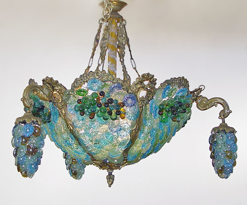 GRAPE MOTIF GLASS CHANDELIER: Constructed from bits of turquoise, green and blue glass on brass frame, 3 clusters of grapes dangle from the central dome.