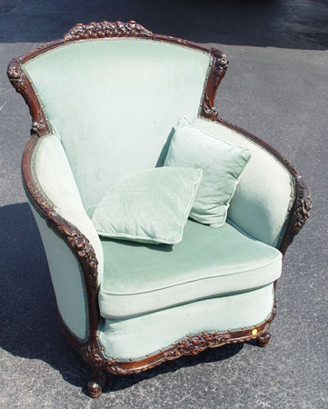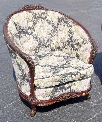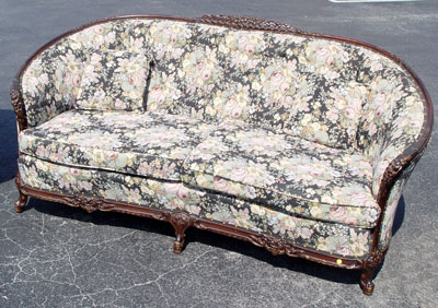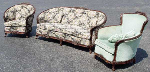 3 PIECE FRENCH CARVED MAHOGANY SOFA AND TWO CHAIRS: Early 20th C. Full length sofa and two overstuffed easy chairs. Floral carved mahogany frames with top rail curving into arm rests. Upholstered in later tapestry and velvet. The sofa is 75'' long and 37''.