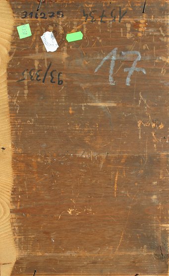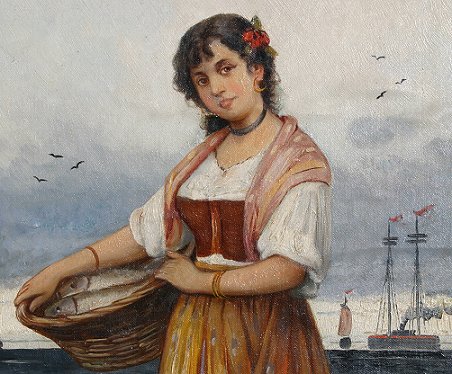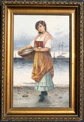 EUROPEAN OIL/CANVAS/BOARD OF MAIDEN WITH BASKET OF FISH: 17 1/4'' x 10 1/2'', gilded frame with wear, 21'' x 14''. Canvas mounted to board, some folds in the upper portion of the painting with some paint loss and in-paint.