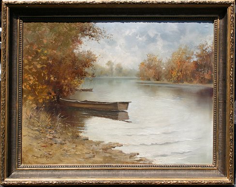 HUNGARIAN RIVER SCENE SIGNED MESZAROS JENO: Oil/Canvas, 24'' x 32'', acanthus leaf gilded gesso molding with wear and over-paint, 29 1/2'' x 38''. Several flecks, good overall.