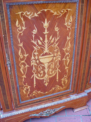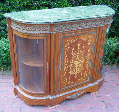 FRENCH STYLE MARBLE TOP INLAY SIDE CABINET: Beveled green marble top, urn design marquetry inlay cabinet door front with glass front display on the curved sides, ormolu mounts. 39 1/4''h. x 51 1/2'' x18''.
