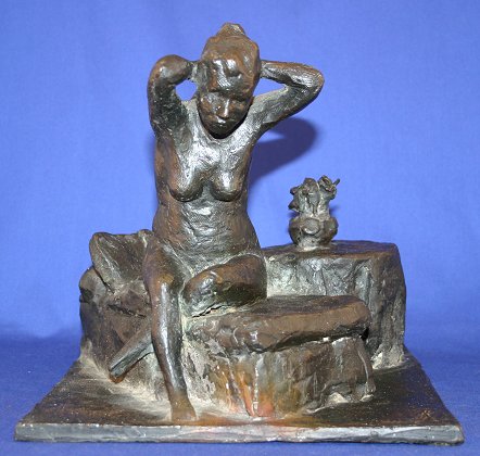 MYSTERY QUALITY SEATED NUDE FEMALE BRONZE SCULPTURE: 8''h., 10 1/2'' x 9 3/4'' base, marked 1 of 4, monogrammed AS?.