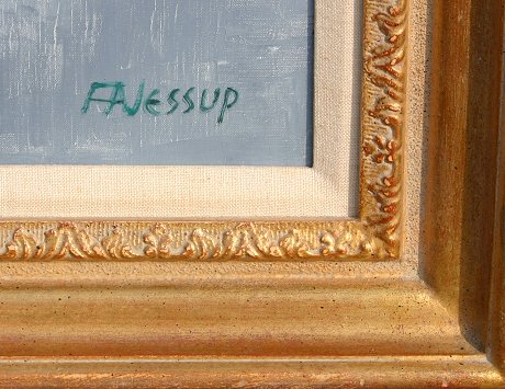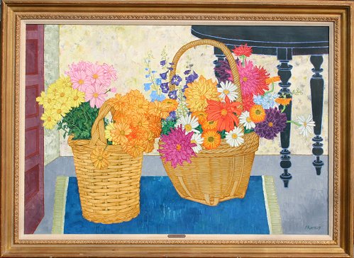 JESSUP, Frederick (Australian, 1920-): Floral Baskets, Still Life, Oil/Canvas, 36'' x 50'', signed, gilded frame with minor wear, 40'' x 55'', purchased at Wally Findlay Galleries, Rodeo Drive Beverly Hills, label affixed verso. Est. $1500/2500**