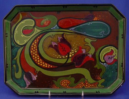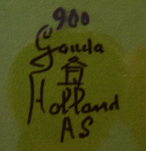 3 PIECE GOUDA POLYCHROME DUTCH POTTERY SERVING SET: To include 1) large ewer, 8 1/4'' high, marked Zuid-Holland 91/281 Gouda. 2) Smaller ewer with cork stopper, 6'' high, marked 592/1 Gouda Holland. 3) Serving tray, 10 1/2'' X 13 1/2'', marked 900 Gouda Holland AS. Dark green and polychrome floral design. Please note rim flakes to glaze on tray.