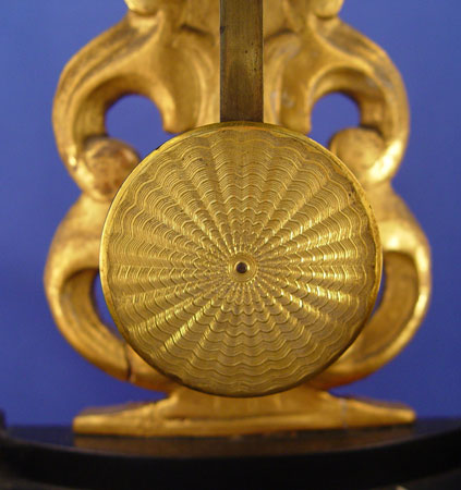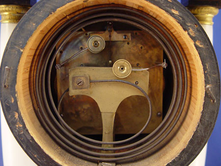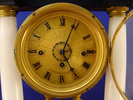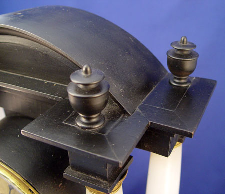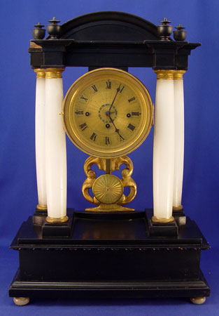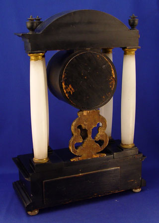 WOOD PORTICO PILLAR CLOCK: Dark painted wood pedestal and base. Alabaster columns. Unsigned movement, key and pendulum. 6'' brass face with time and date. 21'' tall x 14 1/4'' wide x 6 1/8'' deep.
