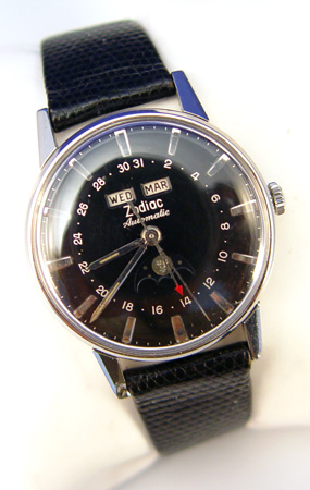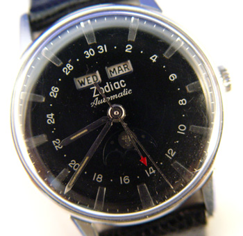 MAN'S ZODIAC AUTOMATIC WRISTWATCH: Zodiac triple date automatic moonphase. Black dial with applied silver-tone bar markers and white Arabic numbers, stainless steel case #1607655, all correctors working. Leather strap with gold filled Bulova buckle, 9''.