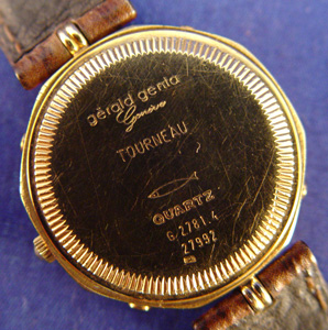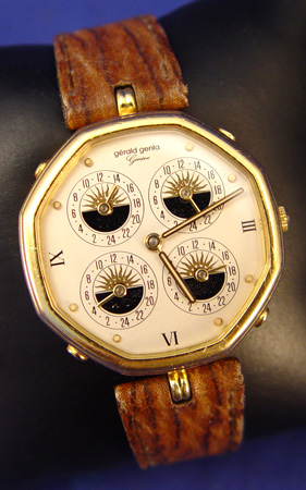 GERALD GENTA ''TOURNEAU'' WRISTWATCH: Gentleman's gold-tone quartz wristwatch by Gerald Genta Geneva. Ivory dial with painted Roman markers and 4 subsidiary dials, case marked G2781 4 27992. Gerald Genta Cousu Main (hand sewn) strap with GG buckle marked 750.
