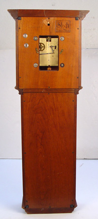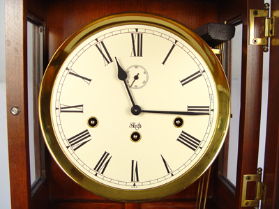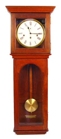 SLIGH SAYBROOK CHERRY WALL CLOCK WESTMINSTER CHIME: Model 1760, 8 day key & pendulum movement with second hand. 8 1/4'' face. Cherry wood case. 35 1/2'' high x 13 1/4'' wide x 6 3/4'' deep.